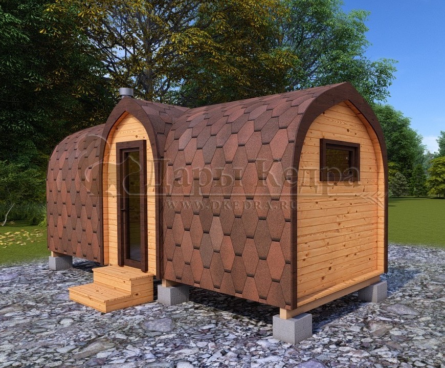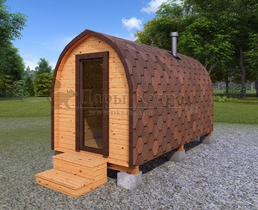 Баня-бочка круглая из кедра 3 метра Это изделие круглой вытянутой формы с двумя отделениями: раздевалкой и парной. Лавочки из кедра находятся по всей длине бани-бочки с обеих сторон. Печь расположена в парилке около дальней стены. Для удобства пользования в раздевалке установлена вешалка и полочка из кедра. За счет небольшой конструкции баня нагревается не более 30 минут. По вашему желанию баню-бочку можно дополнить печью с внешней загрузкой, благодаря которой весь мусор после топки останется на улице. Круглая баня-бочка не требует полноценный фундамент, поэтому при необходимости ее можно перенести в другое место. Обращаем Ваше внимание, что в стандартную комплектацию бани входят лавки в парной с обеих сторон. Дополнительно можно заказать полок открытого или закрытого типа! Кедр обладает ароматическими свойствами. Он не деформируется и влагоустойчив, при правильном уходе за деревом на нем не развиваются грибки и плесень.