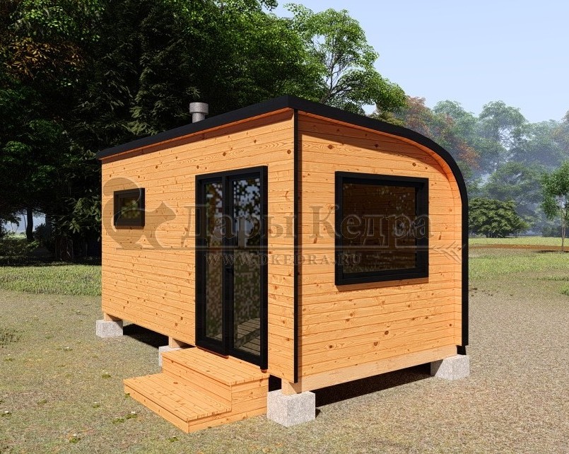 Баня-бочка «Орео» с боковым входом и панорамным окном Стильная и современная баня-бочка с боковым входом может быть выполнена длиною от 4 метров, что-бы было два отделения (парилка и комната отдыха). Полок может быть, как с двух сторон, так и угловой, в стандарте одноуровневый. Печь в данной модели расположена сбоку с топкой наружу, либо внутрь парилки. Печь можно укомплектовать баком для воды, а саму баню сделать длиною до 6 метров, комфортно разместив в ней дополнительно помывочную. В эту модель включено два закаленных стеклопакета: круглое и полукруг, которые мы можем разместить на ваше усмотрение в парилке и комнате отдыха. Обращаем Ваше внимание, по умолчанию в данной модели отсутствует бак для воды, вместо него идёт утеплённая термо-труба, которую можно заменить на бак по желанию.