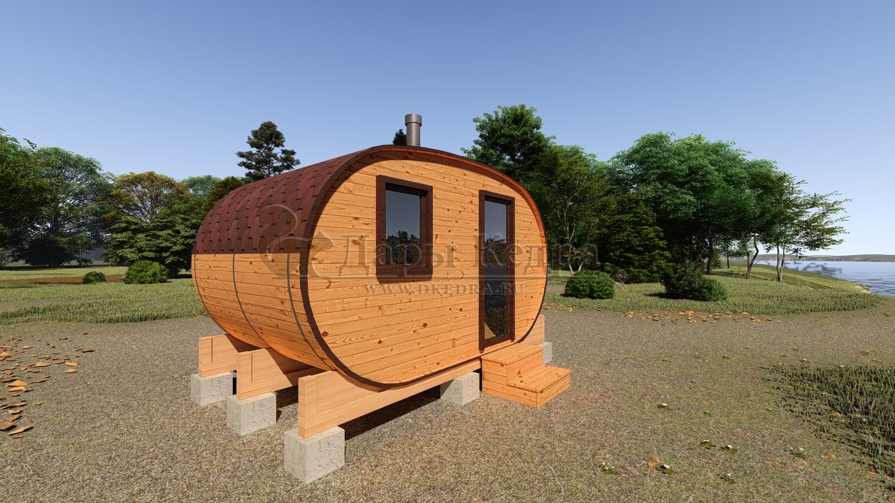 Баня-бочка круглая из кедра 2 метра Это изделие круглой вытянутой формы с одним парильным отделением. Внутреннее пространство включает в себя печь у дальней стены и лавки из кедра по обе стороны бани. За счет компактной формы баня нагревается в течение 30 минут. По вашему желанию ее можно укомплектовать козырьком, верандой и печью с внешней загрузкой, благодаря которой весь мусор после топки остается на улице. Круглая баня-бочка не требует полноценный фундамент, поэтому при необходимости ее можно перенести в другое место. Обращаем Ваше внимание, что в стандартную комплектацию бани входят лавки в парной с обеих сторон. Дополнительно можно заказать полок открытого или закрытого типа! Кедр обладает ароматическими свойствами. Он не деформируется и влагоустойчив, при правильном уходе за деревом на нем не развиваются грибки и плесень.