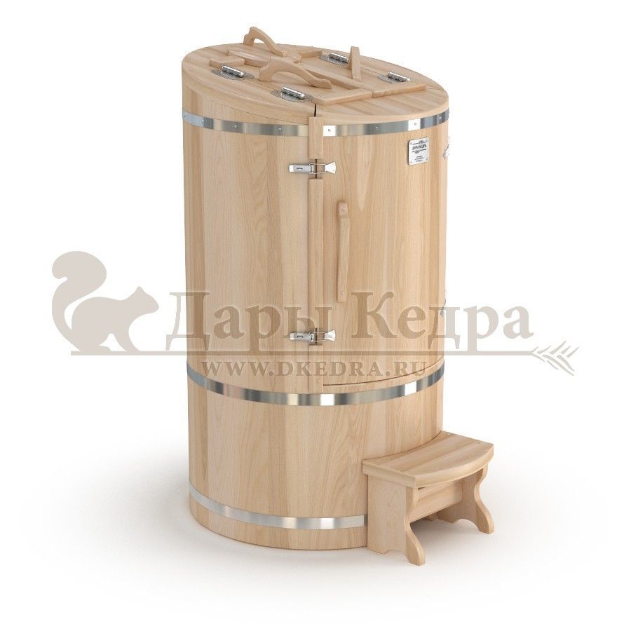 Круглая со скосом. Круглая фитобочка из кедра - это мини парная, которую можно использовать не только в спа-салонах, но и дома. Такая модель наиболее компактна и мобильна. Толщина стенок составляет 25 мм. Фитобочка оборудована откидными створками, дверцей и отверстием для головы. Верхний скос делает положение головы более комфортным и улучшает обзор. Во время парения человек сидит внутри кедровой бочки, а голова находится снаружи. Благодаря этому исключается возможность перегрева. Подлокотники из кедра, встроенные ручки на створках и двери делают эксплуатацию более удобной.