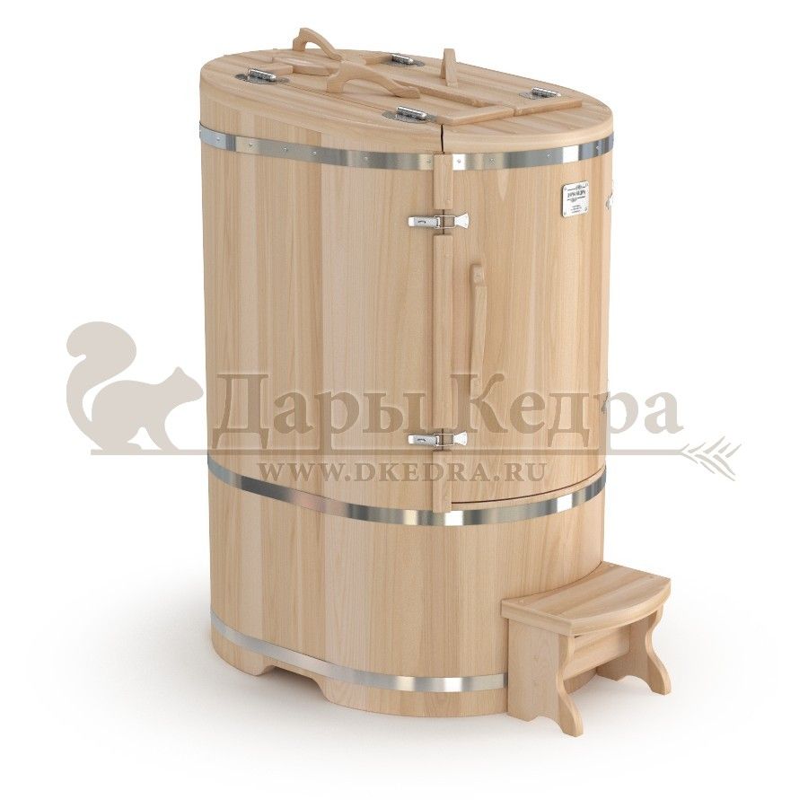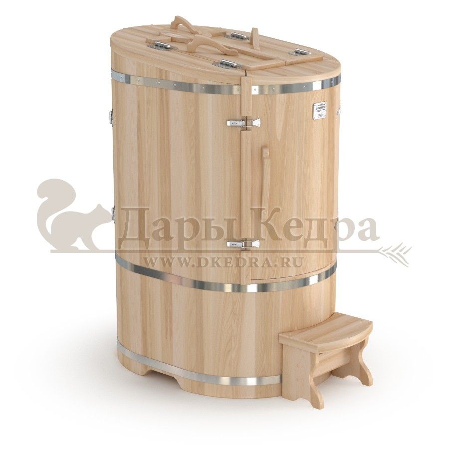 Кедровая бочка (фитобочка) овальная «Профессиональная» Овальная фитобочка из кедра - это мини парная, которую можно использовать не только в спа-салонах, но и дома. Овальная модель более просторна и удобна в использовании. Толщина стенок составляет 40-45 мм, что позволяет увеличить срок службы изделия. Она оборудована откидными створками, дверцей и отверстием для головы. Во время парения человек сидит внутри кедровой бочки, а голова находится снаружи. Благодаря этому исключается возможность перегрева. Подлокотники из кедра, встроенные ручки на створках и двери делают эксплуатацию более удобной. Парение в фитобочке благотворно влияет на организм в целом: повышается иммунитет, выводятся шлаки и токсины, улучшается работа органов тела и состояние кожи.